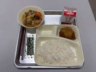 今日の献立は、みそカツ、じゃがいもと野菜の煮もの、焼きのり、ごはん、牛乳です。