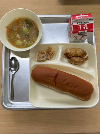 今日の献立は、あげギョーザ、中華みそスープ、れんこんの中華だれかけ、黒糖パン、牛乳です。