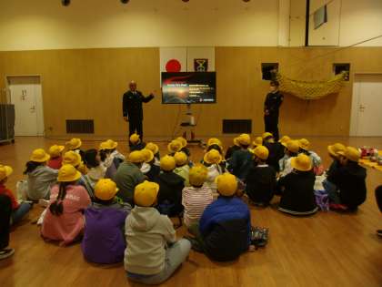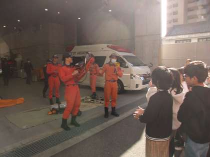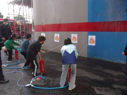 消防士さんたちの仕事についてのDVDを見た後、水消火器の体験をさせていただいたり火災現場で使う道具を持たせていただいたり、消防車に積まれているいろいろな道具を見せていただいたりしました。