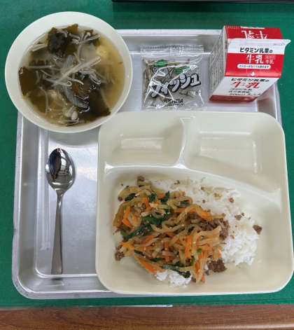 今日の献立は、ビビンバ(ごはん)、わかめスープ、ミニフィッシュ、牛乳です。