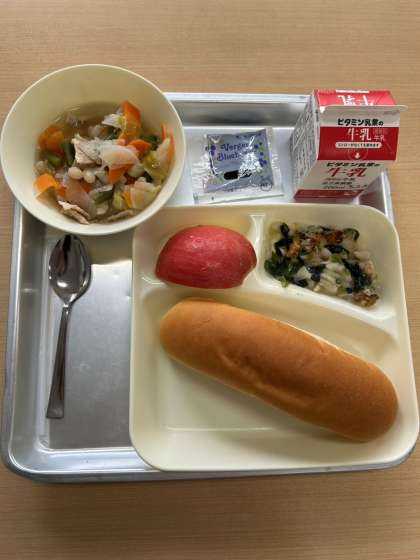 今日の献立は、ほうれんそうのグラタン、てぼ豆のスープ煮、りんご、コッペパン、ブルーベリージャム、牛乳です。