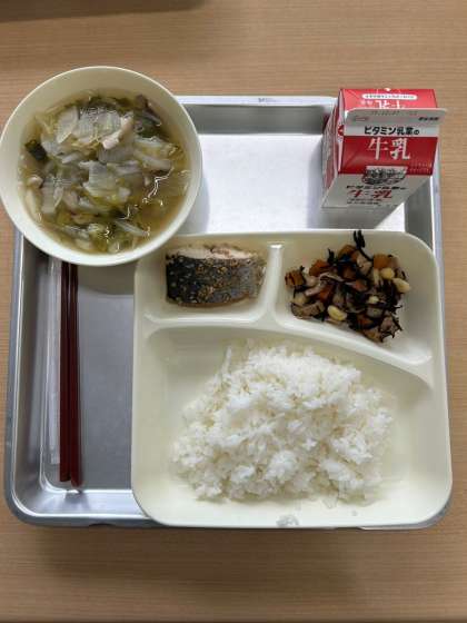 今日の献立は、さごしのごまじょうゆかけ、五目汁、大豆の煮もの、ごはん、牛乳です。
