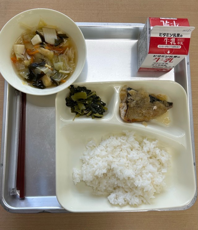今日の献立は、さばのおろしじょうゆかけ、五目汁、こまつなの煮びたし、ごはん、牛乳です。