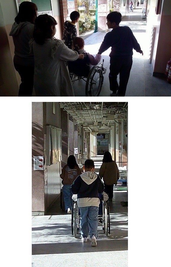 最後に学校の廊下を使って実際の生活に近い状態で車いすに乗ったり、押したりしてみました。