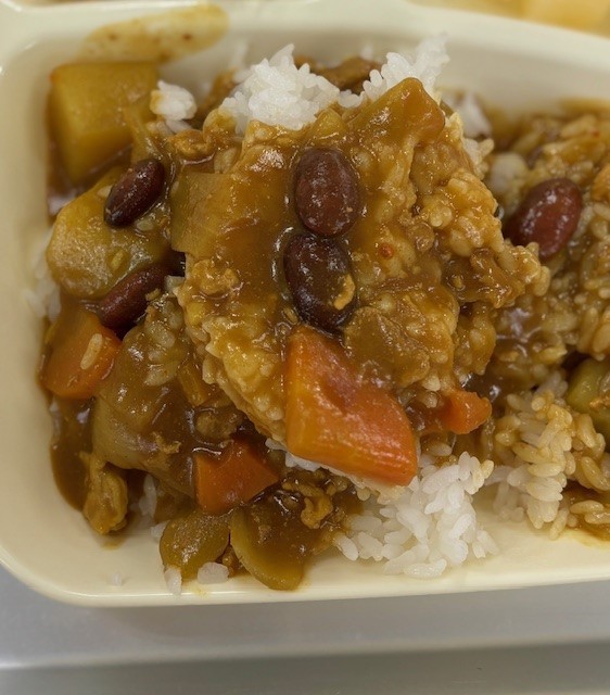 14日は、豚肉と金時豆のカレー。豆が苦手な児童も豆に気が付かずに食べている姿がありました。