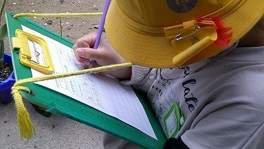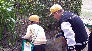 「ダンゴムシがいる!」「あっ、あり!」など見つけた生き物を友だちと確かめ合っています。