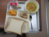 献立:鶏肉のガーリックマヨネーズ焼き、スープ、かき(富有柿)、バター、パン、牛乳...