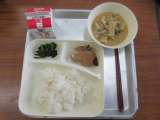 献立:なまりぶしのしょうが煮、みそ汁、ほうれんそうのおひたし、ごはん、牛乳 エネ...