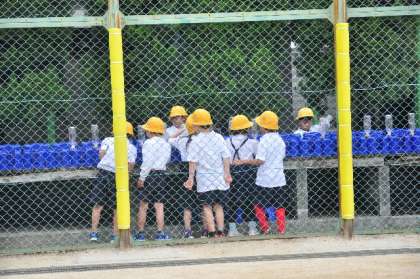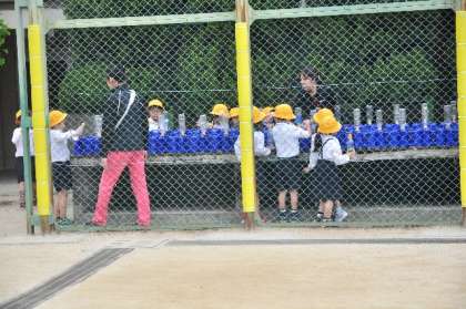 給食室の前に朝顔の鉢を置いています。はじめての水やりです。
