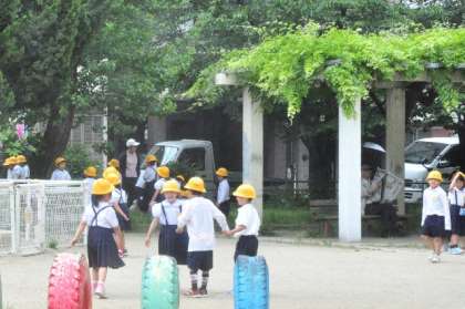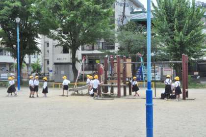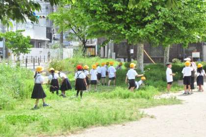 阪陽校園に行きました。クローバーや菜の花、大きな木もあっていろいろ探検しました。5人のグループ行動です。みんなで仲良く手をつないで探検しました。小市保育園のみんなも来ていました。