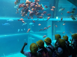 ジンベイザメはすごく大きくて、ゆっくり泳いでいます。たくさんお魚を見ています。