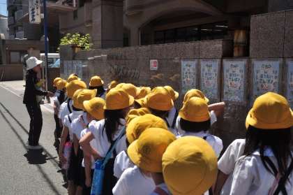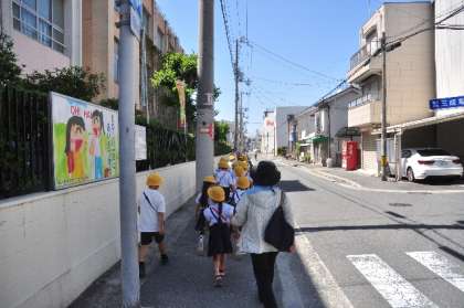 3年生の社会科の学習です。まちたんけんをしました。宝栄の町に何があるのか見て回ります。次に行くときはインタビューもします。