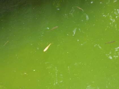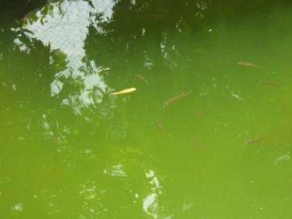 3年生の男子児童が、金色に輝くメダカを見つけました。黒い魚に紛れて泳ぐ金色の魚はきれいです。