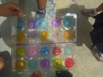 2年生は、卵パックに色マジックで色を塗って、影を観察しました。色のついた影は、カラフルできれいでした。