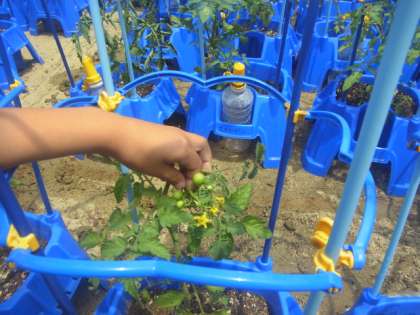 すぐ横には、2年生が育てているミニトマトがあります。もう、青い実になっているものもありました。