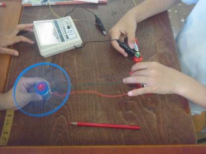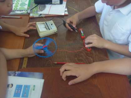 グループに分かれて、並列つなぎと直列つなぎの電流の大きさを測ったり、実際にプロペラを回して、その違いを確かめました。
