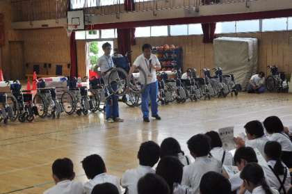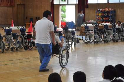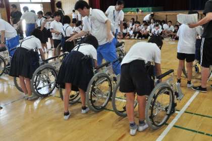 講堂で車いすのおし方、たたみ方等を教えてもらいました。しっかりお話を聞いて、では実際に車いすを触ってみます。この後は校内の段差を車いすで越える実習を行いました。普段見ている風景と車いすから見る風景は全く違って見えます。