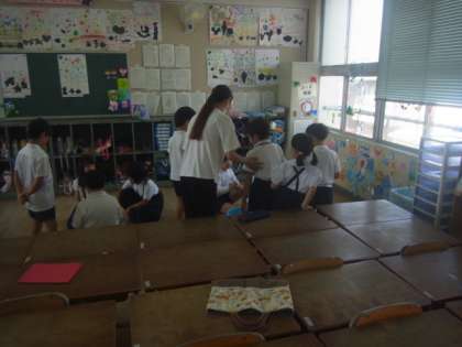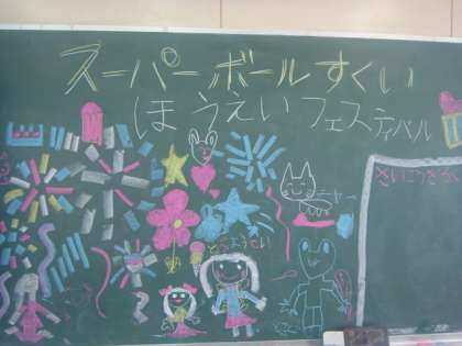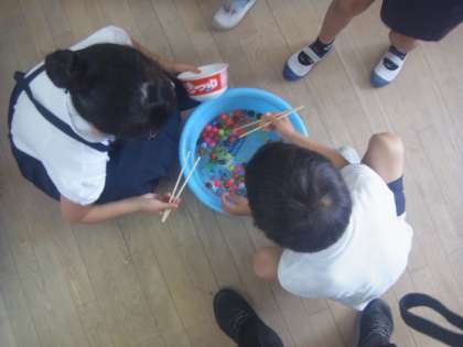 2年2組は、「スーパーボールすくい」です。割り箸を使って、スーパーボールをつかみます。