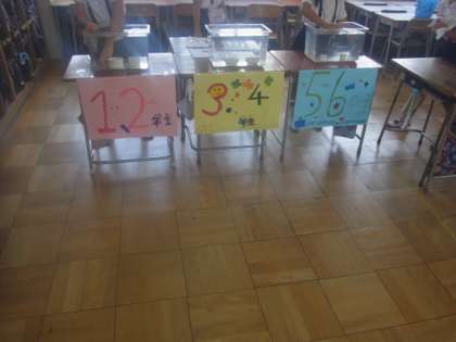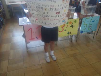 3年3組は、「コイン落とし」です。低学年、中学年、高学年に分かれていて、高学年になると、コインを落とす場所が小さくなって、難易度が上がります。