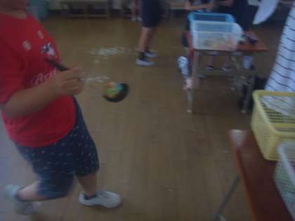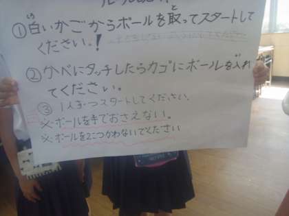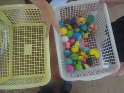 4年2組は、「ボール運び」です。30秒以内に、スプーンにボールをのせて、何個運べるか、どんなボールを選ぶかがポイントです。