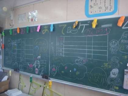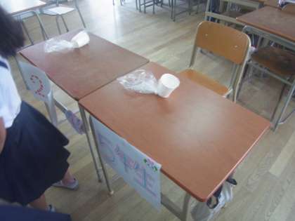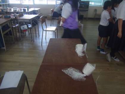 5年3組は、「においあてゲーム」です。どんなにおいなのかな?、歯磨き粉のにおいとか、ソースのにおいを当てます。