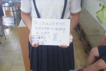 6年1組は、「脱出(なぞとき)ゲーム」です。「ふだはふだだけど、なまえのかいてあるふだはなーんだ?」というなぞを解き、キーワードが合っていたら、脱出成功です。