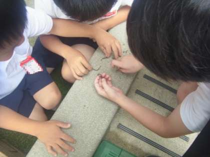 梅雨らしい天気が続きます。午前中、雨が降っていたので、運動場で遊べません。職員室までの花壇で、2年生がミミズを探していました。