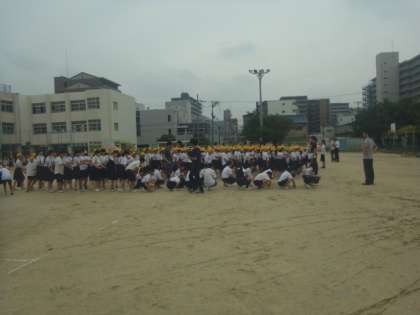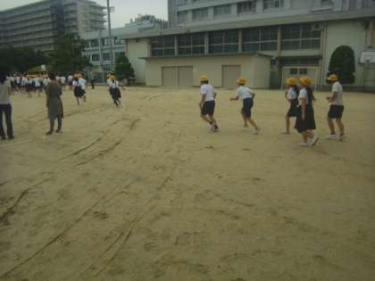 「理科室より火が出ました。運動場へ避難しなさい」