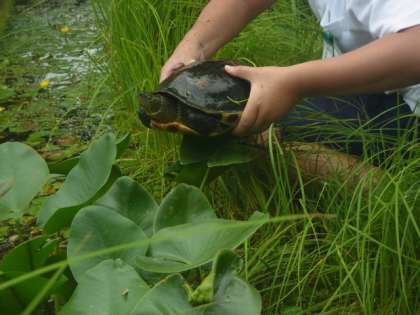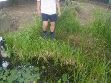 休み時間のたびに、生き物好きな子どもたちが池の周りに集まってきて、生き物を見つけます。大きな亀や、イトトンボなど、珍しい生き物が生息しています。ウシガエルもいるそうです。子どもたちが見つけたら、写真を撮って、HPにあげますので、お楽しみにしていてください。