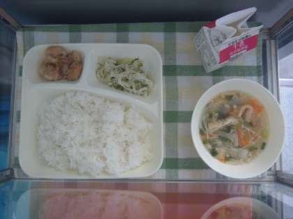 本日の給食は、ごはん、牛乳、鶏肉のマヨネーズ焼き、五目汁、切り干しだいこんのゆずの香あえでした。
