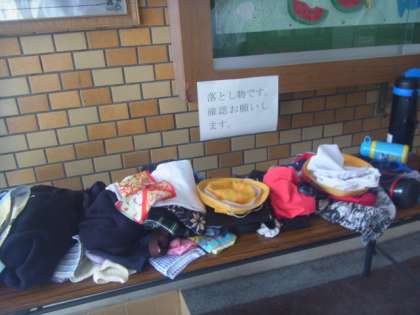 玄関を入ったところの机上に落とし物を並べています。懇談のお帰りにでも、お子さまのものがありましたら、お取りください。
