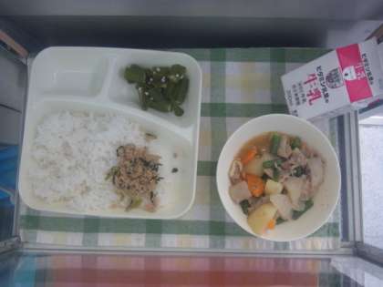 ごはん、牛乳、豚肉とじゃがいもの煮物、オクラの甘酢あえ、ツナっ葉いためです。
