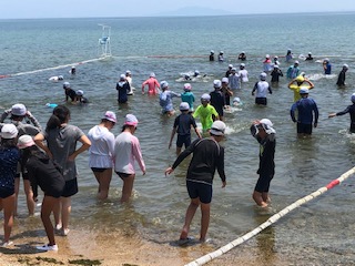 1・2組が湖水浴をしています。水温はプールぐらいで気持ちいいです。みんなの歓声を届けたいです