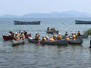 カヤック体験です。4人か3人で1艇を操船します。左右のパドルさばきが難しいようですが、慣れてくると沖まで行けそうです。