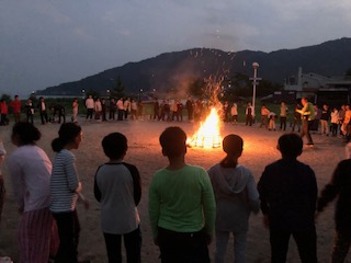 キャンプファイヤーでゲーム、ダンス、歌、元気いっぱいです。