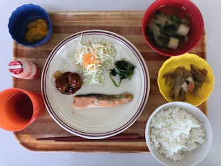 朝ご飯です。焼き魚定食です。係の人から「しっかり朝ご飯を食べて、今日も元気にがんばりましょう」とあいさつがありました。元気にモリモリ食べています。