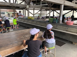 1・2組がカッターに乗ります。3組は、箸作りをします。