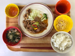 林間学習最後の夕食です、と係からお話がありました。生姜焼き定食です。さっきカレーを食べたのに?元気いっぱいです。