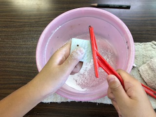 勾玉作りをしています。クーラーの効いた部屋で思い思いの形にしようと削っています。どんな形になるのてしょうか?