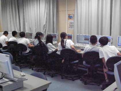 プログラミング教育で修学旅行の思い出をアニメにしてみんなに伝える学習に取り組んでいます。一枚の写真をもとに、キャラクターを動かし、吹き出しで文字を出し、効果音を使って、楽しかった思い出を伝えるアニメづくりです。