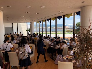 海の見えるレストランで昼食です。カレーライスのバイキング。 サラダのおかわりはできませんが、みんな食欲満点です。