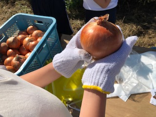 チャレンジファームに到着しました。ツクツクボウシが鳴いています。玉ねぎを軍手で磨いて、4個を一袋に入れます。