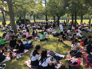 オリエンテーリングが終わりました。班ごとにお弁当を食べています。食べ終わったら芝生の上で遊びます。