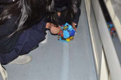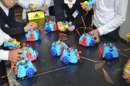 理科で電磁石を学習します。いわゆるファラデーの法則です。そのとっかかりですが、モーターを作ります。そのモーターを使ってロボットをリモコンで動かします。これが結構盛り上がって、理科室は大歓声。机で床でみんなうまく動くように工夫しています。