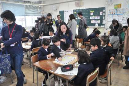 3組は今取り組んでいるプログラミング教育のロボットのすごろくに取り組んでいるところを参観していただきました。