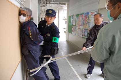 12月4日(木)の3時間目に、東成警察署と東成区役所の方々の協力のもとで、防犯の避難訓練をしました。不審者の侵入を知らせる暗号放送のあと、子ども達は担任の先生の指導できちんと避難をすることができました。同時に、職員がさすまたを使って犯人役の警察官を取り押さえ、110番通報で駆け付けた警察官が逮捕しました。