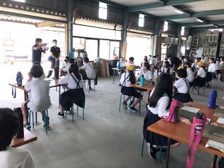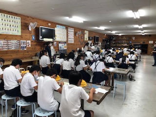 瓦体験です。いつもは、一つの部屋で頭を突き合わせてやってますが、二つの部屋に分けて、竹串や竹のヘラで彫刻をします。できた作品は1カ月ほどして、学校にとどきます。お楽しみに。