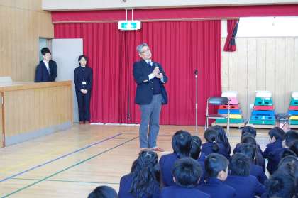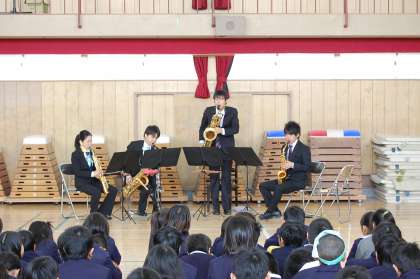 1月17日の土曜授業で音楽鑑賞会が行われました。今回の音楽鑑賞会は、宝栄小学校の同窓会の方々の「宝栄小学校の子ども達のために楽しい思い出をつくってあげたい」という熱い思いで企画されて実現しました。大阪市音楽団のサックス4重奏の素晴らしいハーモニーから次々と楽しい曲が演奏され、子ども達も大喜びでした。体全体を使ってリズムをとる子どもたちや、手拍子を使って曲に合わせてリズムをとる子どもたちで大変盛り上がりました。最後は「赤い屋根の家」の曲を全員で合唱しました。子ども達みんなが、楽しいひと時を過ごすことができました。