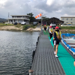 カッターです。重いカイを運んで上船します。みんなで協力して、どこまで行けるかな?