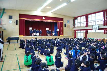 1月22日(木)の児童集会は、給食委員会の発表でした。給食委員会からは「給食クイズ」が発表され、たて割り班で協力して、みんなで答えを考えました。